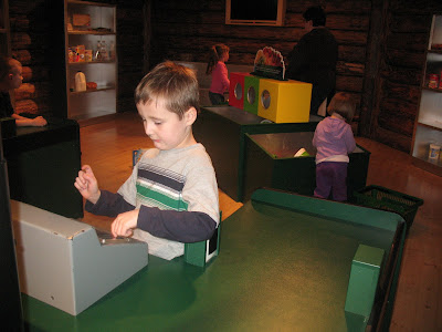 Here are some pics from the pretend play area at the Boonshoft Museum. Kenton the cashier and Emery the shopper!